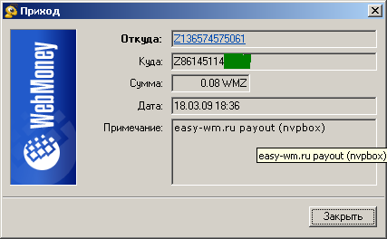 Вот, пожалуйста, скрин... Сегодня вывел минималку 0.10$ (с учетом транзакции WebMoney (0.01%) и трпнзакции сайта - вышло около 0,018$) специально для вас