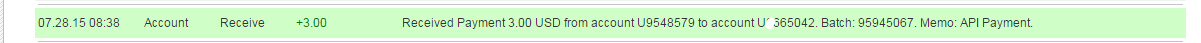 07.23.15 14:43 Account Transfer -99.00 Sent Payment: 99.00 USD to account U9548579 from U8665042. Batch: 95502527. Memo: Shopping Cart Payment. Member Id - 82.