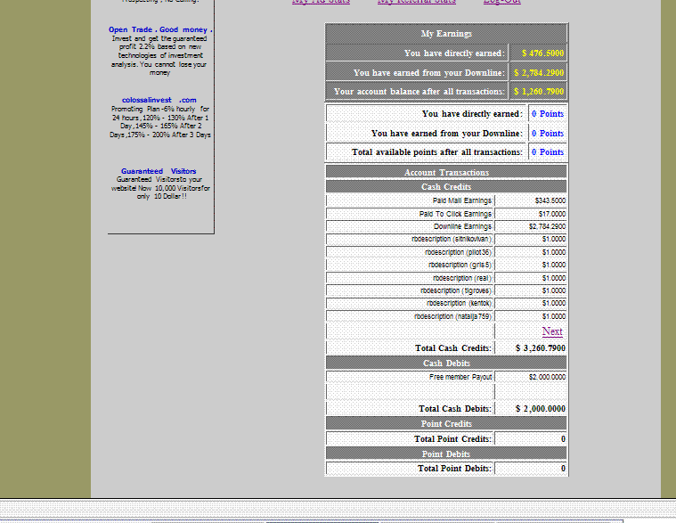 3)Request Payout - Это где вы можете заказать Перечисление денег на ваш счет E-Gold, Но! Пока вы не наберете сумму 2000 долларов, вы не сможете перевести деньги, только после того как вы их набрали появится кнопка. Также есть система апгрейда аккаунта: Золотой, Платиновый, Бриллиантовый. Если сделать апгрейд ЗОЛОТОЙ, то минимальная сумма выплаты составит уже не 2000 долларов, а 400. Платиновый апгрейд 200 минимально. И Бриллиантовый составляет 100 долларов минимально. Если вы не апгрейдились, то не вздумайте заказывать выплату 100, 200, или 400 долларов, потому что они у вас пропадут. Вы должны набрать только 1000 долларов. Потом только заказывать выплату.