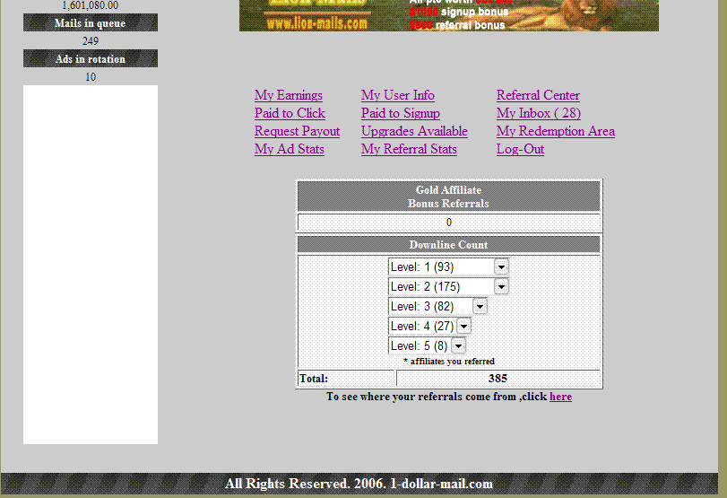 8)My Referral Stats - Здесь показано, сколько у вас на данный момент рефералов. У них 5 уровней рефералов, за 1 уровень платят 20% от заработка рефералов, за второй уровень 15%, за 3 уровень 10%, за 4 уровень 5%, за 5 уровень 3 процента. Плюсом сразу платят 1 доллар за каждого приглашенного реферала. Советуем искать рефералов, т.к. с увеличением их числа, они начнут приносить больший доход, чем вы получаете по кликам. Так что подключайте друзей, ищите по чатам, форумам, или ICQ, что самое эффективное.