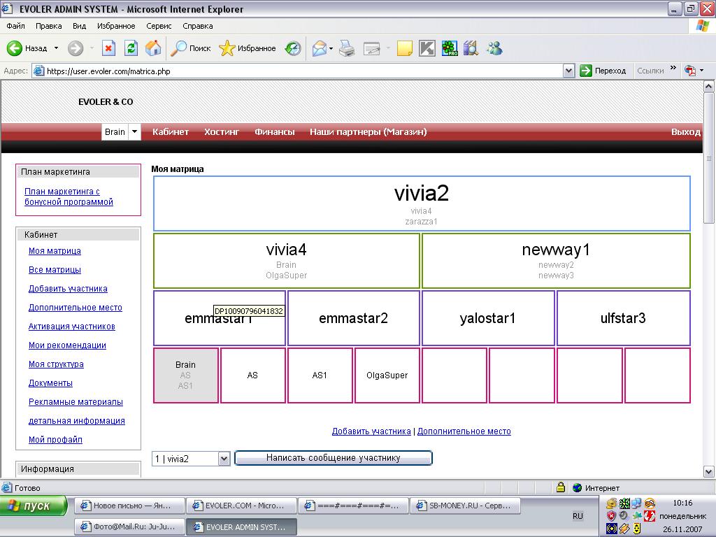 Вообще там такая система ... (про двух человек).... По условию чтобы получать деньги нужно привести минимкм 2 человек. за них будете получать как только пирамид заполнится по 500 евро. если приведете 4 человек то получать будетет 1000 евро. деньги выплачиваются как только вы оказываетесь на самом верхем уровне. Всего 4 уровня (15 человек)).... и вся пирамида будет заполнена. заполнение пирамиды может быть знакомыми вами людьми и совершенно не знакомыми.... выкладываю скрин своей пирамиды. Я под ником Brain/ привел двух человек AS, AS1... потом пришла ольгасупер, которую я не знаю.
