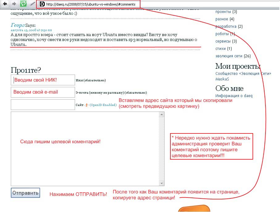 1. Вы регистрируетесь на сайте. При регистрации указываете свой Z-кошелек (Web-money). Вы всегда сможете поменять его. (Если не будет графы, где нужно указать кошелек, то после регистрации зайдите в свой профиль и в графе AIM впешите его) 2. Заходите в автоматизированную систему приема ссылок. 3. Заходите к себе в аккаунт, там 4 вкладки: “Деньги" "Оптимизатор" "Постер" "Блоги”. "Оптимизатор" не нужен вам, для начала вам нужна вклада "Блоги” там внизу таблица "Перейдите по ссылке и оставьте комментарий" выбирайте любой сайт (лучше чтобы ТИЦ был больше или равен 30) переходите на сайт, скорее всего это будет блог, и коментируйте любую новость, затем вводети Имя, Почту и Сайт. Сайт вводите ни какой попало, а берите из раздела "Постер" там вы увидете такаю фразу "Сейчас я плачу вам за размещение ссылок на: (текст ссылки копируется в буфер обмена)" и Ссылки с описанием, выбирете любую на ваш взгляд подходящую, скопируйте её и вставте в графу Сайт, там где вы толкьо что откоментировали. 4. После того как ваш комментарий появился в Интернете, вы копируете ссылку на этот комментарий и вставляете в графу "Добавленные вами ссылки" и добавляете её (закладка “Постер”). 5. Если робот пройдя по указанной ссылке найдет там вашу ссылку на один или несколько указанных мной сайтов, вам на счет СРАЗУ зачисляются деньги. 6. Минималка 10$, выплаты производятся раз в неделю, по вторникам 7. Сейчас оплата такая – 20 центов за 1 комментарий. То есть 10 коментов = 2 бакса! 8. Нужны более мение осмысленные коментарие, за спам штрафуют. Это новые правила с моим описанием, если что то не понятно спрашивайте тут или по аське 209-047-933 Сегодня получил выплату!!! ![]() Регистрация Если что то не получится с регой, не придёт письмо с паролем, то заходите на форум и напише об этой проблеме, админ вышлет письмо в ручную, или пишите мне, разберёмся. |