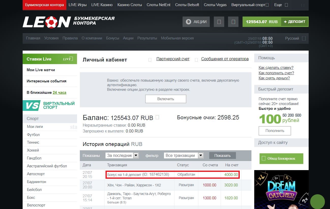 ... бонус на первый депозит отыграть здесь трудновато - "вагер" довольно большой. Ничего подобного. Отыгрыш бонуса здесь не представляет трудностей. По крайней мере для тех, кто пришел в мир ставок надолго. Дело в том, что в БК Леон, в отличие от большинства других букмекеров, время на отыгрыш бонусной суммы НЕ ОГРАНИЧЕНО! То есть, клиент внес первый депозит и забыл о бонусе. Он просто продолжает делать ставки. И когда-то (через месяц, год или несколько лет) получает приятный подарок в виде бонуса. Так было и со мной. Я получил бонус совсем недавно, хотя регистрировался в конторе очень давно: |