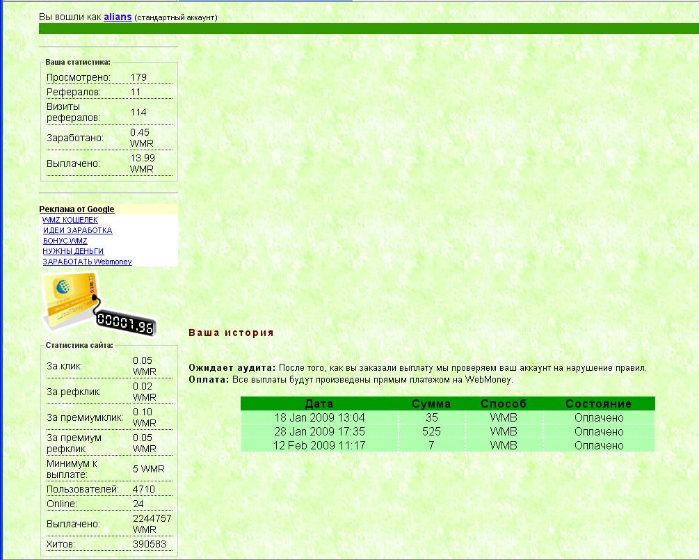 За клик: 0.05 WMR За рефклик: 0.02 WMR За премиумклик: 0.10 WMR За премиум рефклик: 0.05 WMR Минимум к выплате: 5 WMR Пользователей: 4685 Выплачено: 2244535 WMR последняя выплата