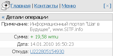 Начинающий ![]() Группа: Пользователи Сообщений: 19 Регистрация: 13.1.2010 Пользователь №: 7 289 На форуме: 0d 3h 19m 19s Заработано:0.164$ Выплачено:0$ Штрафы:0$ К выплате:0.164$ Пол: женский Репутация: 0 |