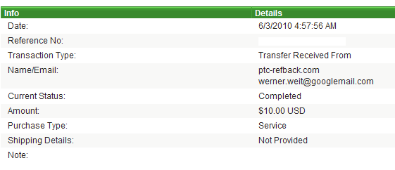 Я приглашаю Вас в нашу команду.PTC-RefBack предлагает Вам уникальную возможность заработка на зарубежных спонсорах с оплатой за просмотр рекламных объявлений на РТС-сайтах(буксах) и является профессиональным проектом с оплатой за реферальство. Мы всей командой тестируем спона на выплату за несколько дней(максимум - неделя),если платит-работаем и получаем деньги. Проект растёт и развивается.В сети мы уже больше года.PTC-RefBack стартовал в апреле 2009 года.Нас уже 2279 чел. Недавно подключили английскую версию проекта.Вы ничего не теряете, а только выигрываете...Кроме того,что Вы будете получать свой заработок на BUX-ах, от команды Рtc-refback Вы будете получать от 50% до70% рефских.До 100% рефских Вы сможете получить с тех спонсоров где командный аккаунт взял апгрейд и ещё от 10% до 15% с помощью своих рефералов пришедших на проект за Вами. Если Вы новичок с нами пройдёте все азы и начнёте зарабатывать свой стартовый капитал в индустрии РТС ,всё начинается с малого.Все мы когда-то начинаем с нуля.Дальше-больше.Много полезной информации на сайте и подтверждений выплат на форуме .Сделать заявку своей RefBack выплаты вы можете в любой момент, как только наберете минимальную сумму 2$. Все выплаты производятся на Ваш: AlertPay / PayPal / WebMoney счета в течении 24 часов. Помните всегда: "Пока одни сомневаются и не верят - другие получают деньги!" Присоединяйтесь к нашей команде и проверьте на деле, как это работает.Не упустите свой шанс. Регистрация: http://u.to/lrMg Несколько скринов,полученных выплат: |