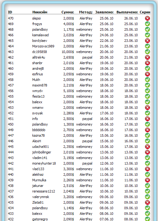 Наш проект удобен и выгоден,как новичку, так и опытному юзеру.Ваш заработок зависит только от Вашей активности в кликах на буксах, а также в наборе рефералов на буксы и на проект.И всё это реально выполнимо. Мы всегда рады новичкам!Жми сюда! Последние выплаты полученные в прошлом году(скрины не выкладываю - слишком много и так...) #805 $2,00 AlertPay Выплачено 2010-11-30 #827 $2,00 AlertPay Выплачено 2010-12-09 #848 $2,00 AlertPay Выплачено 2010-12-17 #869 $2,00 AlertPay Выплачено 2010-12-27 И уже в этом году...но и это ещё не все. ![]() ![]() ![]() Статистика выплат нашим пользователям. ![]() Удачи!!!Приходите к нам - мы Вас ждём в нашей команде! |