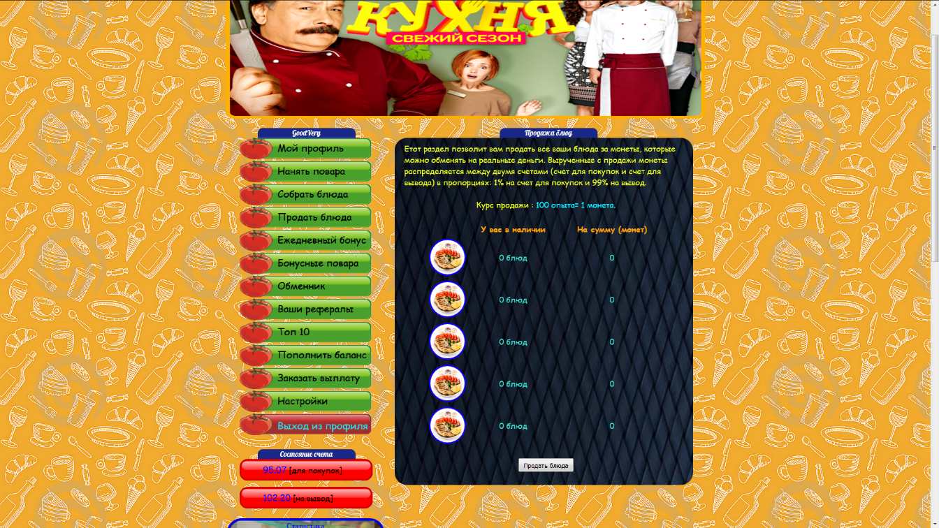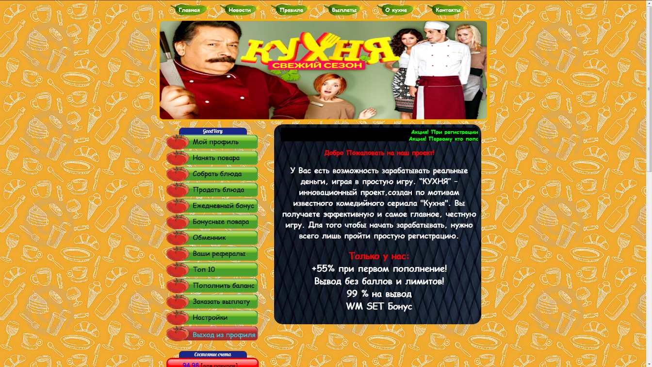 Добро Пожаловать на проект! У Вас есть возможность зарабатывать реальные деньги, играя в простую игру. “КУХНЯ” – инновационный проект,создан по мотивам известного комедийного сериала "Кухня". Вы получаете эффективную и самое главное, честную игру. Для того чтобы начать зарабатывать, нужно всего лишь пройти простую регистрацию. +55% при первом пополнении! Вывод без баллов и лимитов! 99 % на вывод WM SET Бонус Повара В этом разделе Вы можете нанять различных поваров. Каждый повар готовит блюда которые можно потом продать и обменять на реальные деньги. Каждый повар готовит разное количество блюд, чем дороже он тем больше готовит блюд. Вы можете нанимать любое их количество,повара не исчезают,не болеют,не умирают и будут готовить блюда всегда. Перед тем как нанять повара следует собрать блюда! Настя Готовит: 10 блюд Цена: 100 монет Лёва Готовит: 400 блюд Цена: 5000 монет Огузок Готовит: 2400 блюд Цена: 30000 монет Сеня Готовит: 5400 блюд Цена: 54000 монет Шеф Готовит: 10000 блюд Цена: 105000 монет Сборка блюд Собирайте в этом разделе ваши блюда. Ваши повара готовят блюда каждые 10 минут. Блюда постоянно накапливаются, не обязательно собирать каждые 10 мин. достаточно собрать его раз в месяц. Как вам удобнее. Продажа блюд Этот раздел позволит вам продать все ваши блюда за монеты, которые можно обменять на реальные деньги. Вырученные с продажи монеты распределяется между двумя счетами (счет для покупок и счет для вывода) в пропорциях: 1% на счет для покупок и 99% на вывод. Курс продажи : 100 опыта= 1 монета. Партнерская программа Приглашайте в игру своих друзей и знакомых, Вы будете получать 10% от каждого пополнения баланса приглашенным Вами человеком. Пополнение и вывод через Payeer Мой вклад в проект: И последний вывод из системы: |