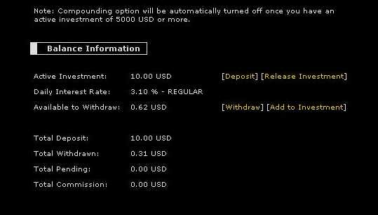 Планы ( их всего-4 ) REGULAR 3.10% 5 USD - 200 USD DELUXE 3.30% 201 USD - 500 USD PREMIER 3.70% 501 USD - 2000 USD VIP 4.30% 2001 USD - 5000 USD Срок не ограничен, рефкомиссия - 5% от его депозита Пока действует система бонусов: 1. Всем активным участникам 1$ на E-Gold, нужно им написать письмо и указать необходимые данные (подробности на сайте). 2. Любым участникам 0,5$ на E-Gold, необходимо в своей подписи разместить баннер проекта и указать необходимые данные (подробности на сайте). Информация на мониторах и moneymakergroup.com только положительная, проблем не замечено. Также лично получены первые выплаты. Бонус только заказал. Регистрация onestarfinance.com ![]() |
