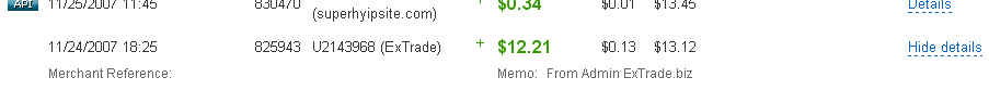 extrade.biz - Подробности Проект открылся 20 сентября 2007 года. Открыты 4 плана: - Бронзовый: 10% ежемесячно, вклад 20-100$ - Серебряный: 11% ежемесячно, вклад 100-200$ - Золотой: 12% ежемесячно, вклад 200-300$ - VIP: 14% ежемесячно, вклад 300-400$ Ввод средств через различные платежные системы, в том числе e-gold, wm, Liberty Reserve. Администратор проекта доступен для общения на форуме и в ICQ. Цитирую слова администратора данного проекта: Рад приветствовать Вас на сайте ExTrade.Biz! Это инвестиционный фонд, созданный мной для диверсификации средств вкладчиков. Проект рассчитан на узкий круг профессиональных инвесторов. Я не планирую набирать огромные суммы в оборот. Мне необходимы лишь те средства, которые я смогу прокрутить в разных областях инвестирования и бизнеса. Предположительно это 30000 долларов. После этого, проект станет закрытым клубом для "избранных". Почему именно эта сумма? Я не первый год занимаюсь электронной коммерцией и реально оцениваю свои возможности. Это та сумма, которую я смогу крутить и получать прибыль, при этом, не рискуя потерять всё из-за не хватки резервов. Кроме того, я проконсультировался с несколькими успешными "монимейкерами" рунета. И только после этого принял окончательное решение открыть свой собственный инвестиционный фонд. Просчитав, все риски и адекватно оценив ситуацию, я пришёл к выводу, что благодаря моей деятельности, фонд может обеспечить постоянную и фиксированную прибыль до 14% ежемесячно. Полученные от инвесторов деньги не будут лежать мёртвым грузом на моих счетах. Все они будут работать в разных сферах электронной коммерции. Я планирую, в разных пропорциях, распределить их между высокодоходными проектами (AutoSurf, HYIP`s), надёжными инвестициями (Доверительное управление, трейдинг) и собственными проектами. Всё это, по моим расчётам, должно обеспечить доход в размере не менее 14% в месяц. Прилагаю скрин своего вклада в данный проект. По поводу метода вложения средств. Он несколько не тривиален, но занял у меня не более 5 минут. В данном случае считаю. что такой способ является дополнительным гарантом безопасности вложенных средств. Сама процедура внесения в средств была примерно такой - Списаль по аське с Андреем, админом проекта. По аське он мне скинул номер своего WMZ. Перевел деньга на этот кошелек со своего WMZ (что очень удобно) и по аське же получил некий набор цифр (достаточно длинный), являющийся пин кодом сделки. Ввел пин код в своем аккаунте и получил на своем счете 100 у.е. Далее деньги со своего счета внес на один из планов с указанием срока вклада (см. скрин). В общем то быстро и "безболезненно". :-) В общем не настаиваю, но рекомендую обратить внимание на проект. |