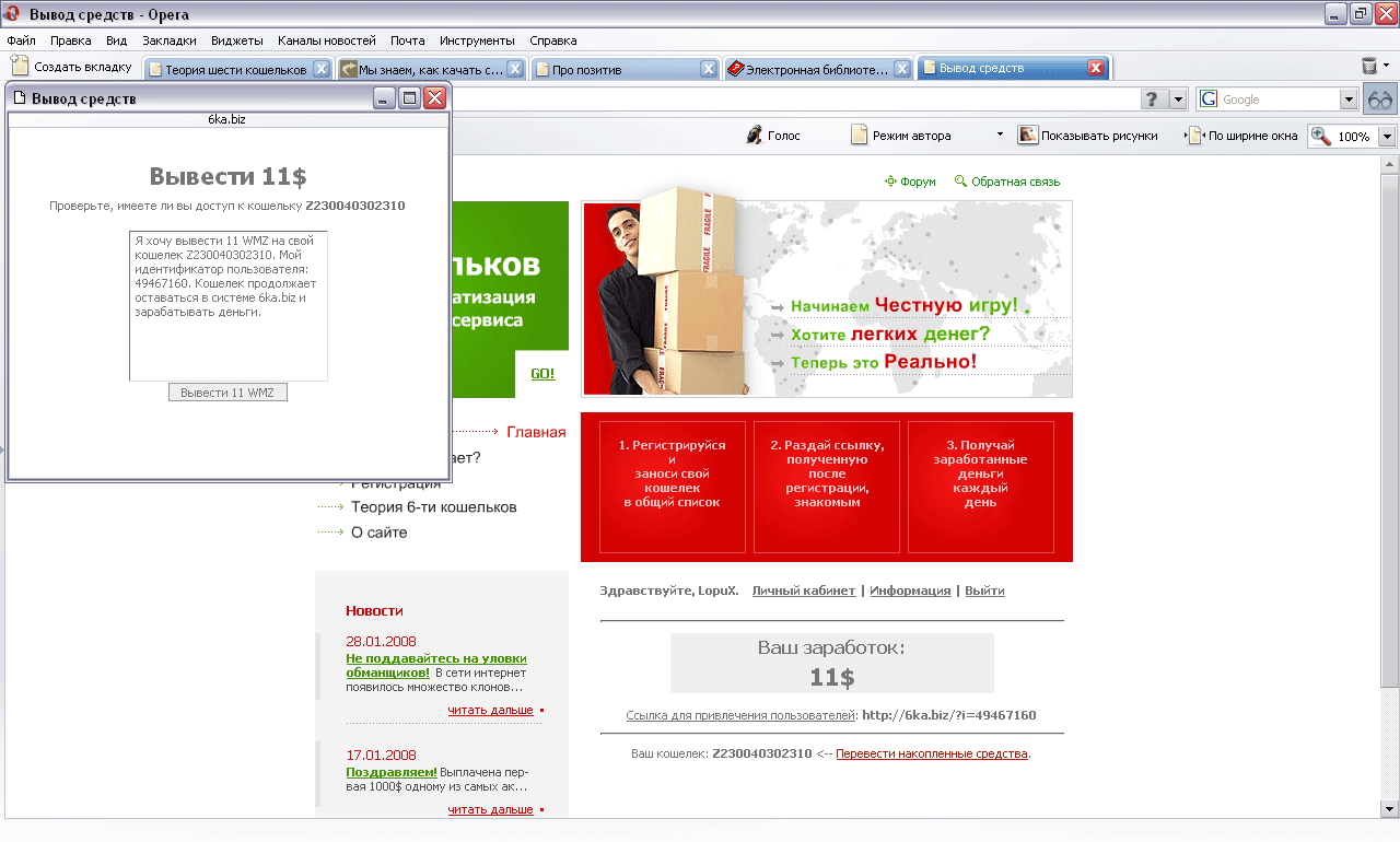 Отчет №2 Зарегистрировался через прокси под новым логином, снова оплатил те же 6$ и забросил рекламу на десяток досок объявлений... Сегодня захожу под новым логином - на счету 11$! )) Сердце заколотилось, выведутся или нет?.. Сделал запрос на вывод, попросили подождать около часа, и примерно через минут 20 на мой кошелек упали 11WMZ! Мысленно поблагодарил создателей такого полезного сервиса и заказал на эти деньги спам-icq-рассылку своей рефСсылки =))) Чем-то мне этот сайт импонирует))) Ну что я могу сказать, как средство дополнительного заработка без напряг 6ka.biz можно смело использовать! Это, конечно, не 1000$ обещанных в месяц, но на свой кусок хлеба с икрой хватит )) P.S. Если все будет хорошо - ждите третьего отчета |