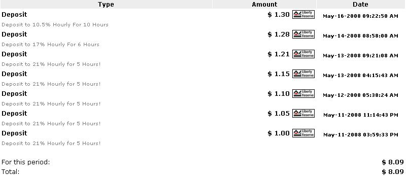 11% Daily For 15 Days Plan Spent Amount ($) Daily Profit (%) Plan 1 $1 - $100 8.00 Plan 2 $101 - $500 9.00 Plan 3 $501 - $1,000 10.00 Plan 4 $1,001 - $5,000 11.00 2% DAILY FOR 100DAYS Plan Spent Amount ($) Daily Profit (%) Plan 1 $1 - $100 2.00 Plan 2 $101 - $1,000 2.20 Plan 3 $1,001 - $5,000 2.50 Рефералы 5% Мои вклады: Как видите были часовые выплаты, но теперь только ежедневные. Сегодня заказал выплату и через минуту получил на Liberty Reserve Регистрация |