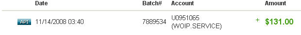 Batch : 7720975 From Account: U0951065 Amount: $1.00 Memo: Withdraw request. Date : 2008-11-11 09:14:51 Batch : 7764955 From Account: U0951065 Amount: $1.00 Memo: Withdraw request. |
